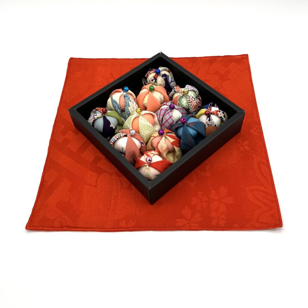 ぷっくりとした飾り用に制作したものです。一枚一枚に込められた想いや温もりをお手玉というかたちに仕立てながら物を大切にする気持ちや、和の優しさをあらためて感じています。
